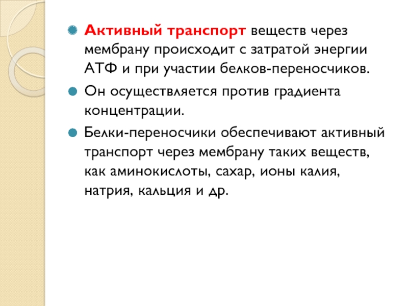 Белки-переносчики обеспечивают активный транспорт через мембрану таких веществ, как аминокислоты, сахар, ионы калия, натрия, кальция и др.