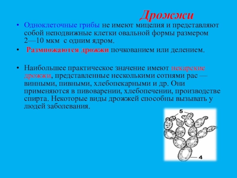 Одноклеточные грибы не имеют мицелия и представляют собой неподвижные клетки овальной формы размером 2—10 мкм с одним ядром.