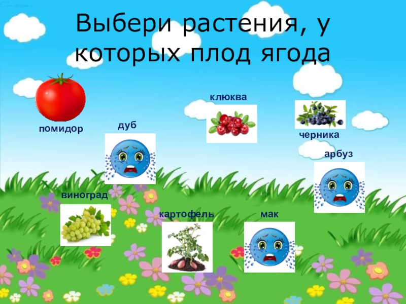 Выбери растения, у которых плод ягода клюквапомидордубчерникавиноградкартофельмакарбуз