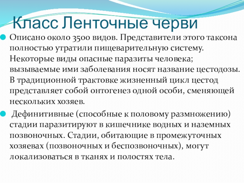 пищеварительную систему. Некоторые виды опасные паразиты человека; вызываемые ими заболевания носят название цестодозы. В традиционной трактовке жизненный цикл цестод представляет собой онтогенез одной особи, сменяющей нескольких хозяев.