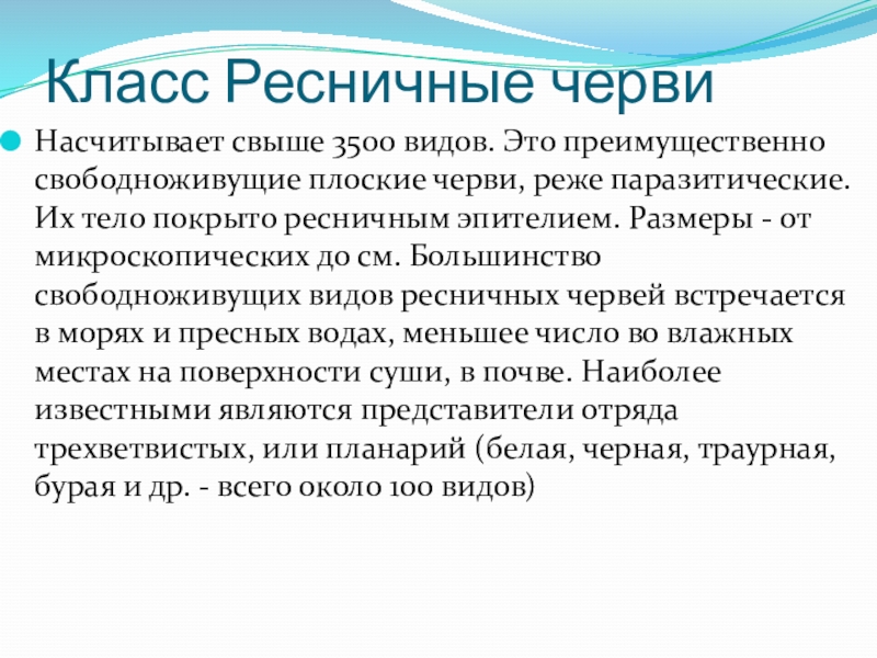 Класс Ресничные червиНасчитывает свыше 3500 видов. Это преимущественно свободноживущие плоские черви, реже паразитические. Их тело покрыто ресничным