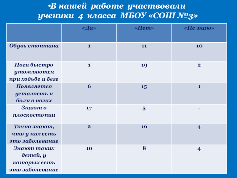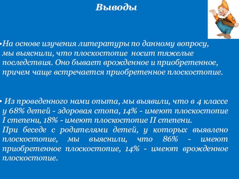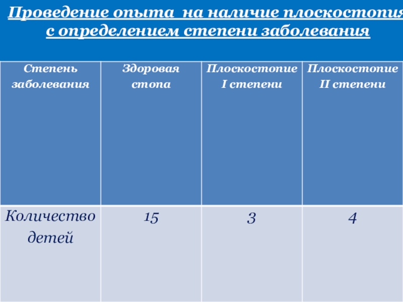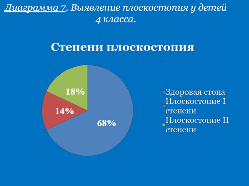 Из проведенного нами опыта, мы выявили, что в 4 классе у 68% детей - здоровая стопа, 14% - имеют плоскостопие I степени, 18% - имеют плоскостопие II степени.