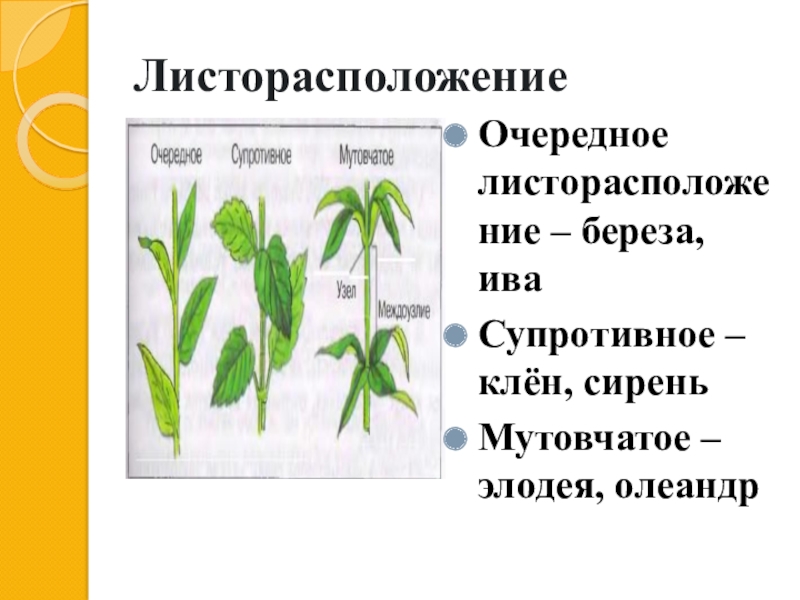 ЛисторасположениеОчередное листорасположение – береза, иваСупротивное – клён, сиреньМутовчатое – элодея, олеандр