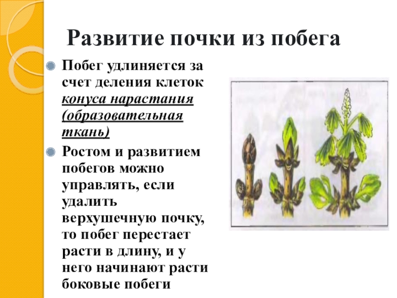 Развитие почки из побегаПобег удлиняется за счет деления клеток конуса нарастания(образовательная ткань)Ростом и развитием побегов можно управлять,