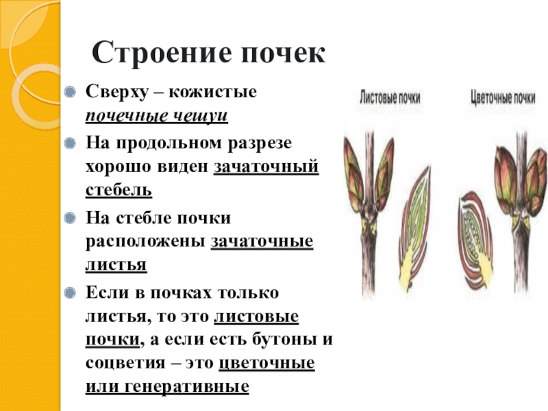 Если в почках только листья, то это листовые почки, а если есть бутоны и соцветия – это цветочные или генеративные