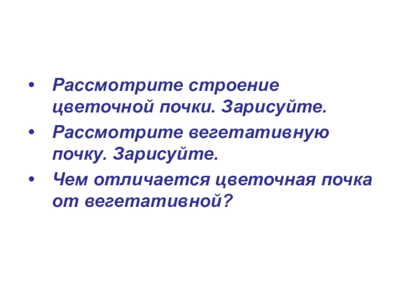 Рассмотрите строение цветочной почки. Зарисуйте.Рассмотрите вегетативную почку. Зарисуйте.Чем отличается цветочная почка от вегетативной?