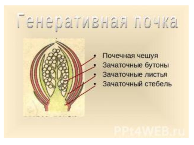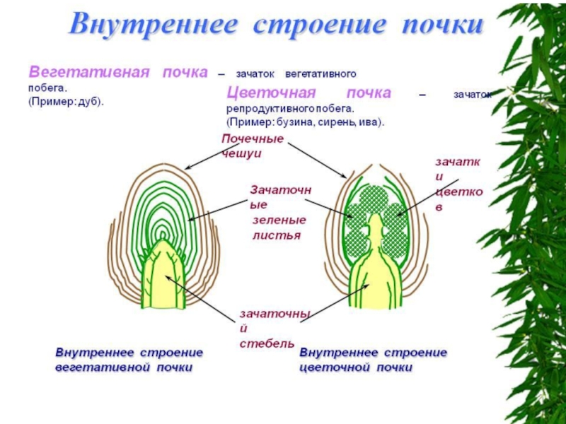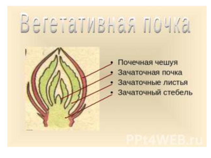 Тема:«Строение вегетативных и цветочных почек».Цель работы: изучить строение листовой и цветочной почки, доказать , что почка -