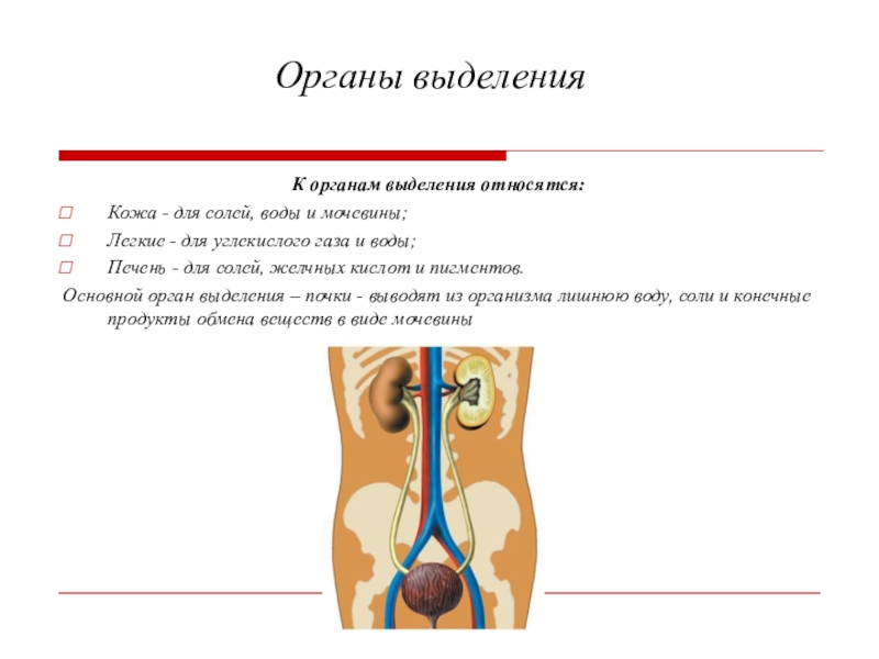 Основной орган выделения – почки - выводят из организма лишнюю воду, соли и конечные продукты обмена веществ в виде мочевины