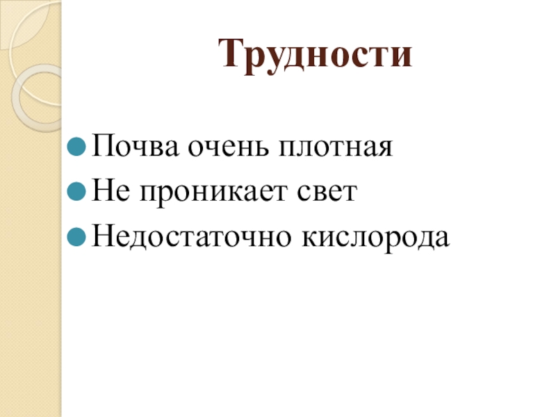 ТрудностиПочва очень плотнаяНе проникает светНедостаточно кислорода