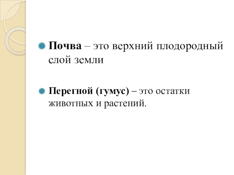 Почва – это верхний плодородный слой землиПерегной (гумус) – это остатки животных и растений.
