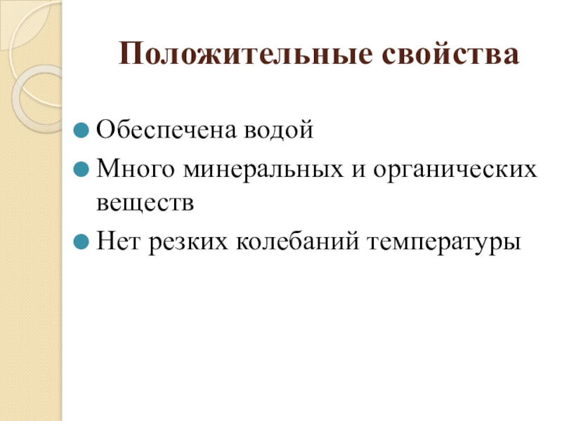 Положительные свойстваОбеспечена водойМного минеральных и органических веществНет резких колебаний температуры