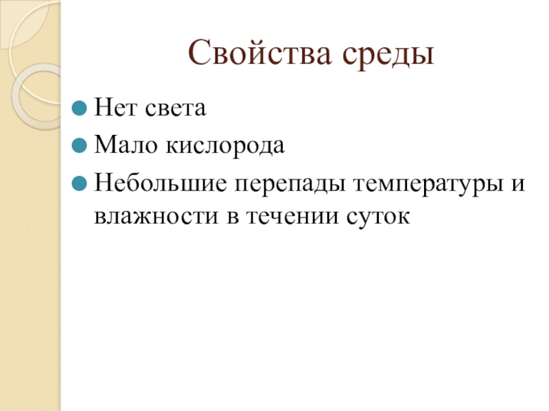 Свойства средыНет светаМало кислородаНебольшие перепады температуры и влажности в течении суток