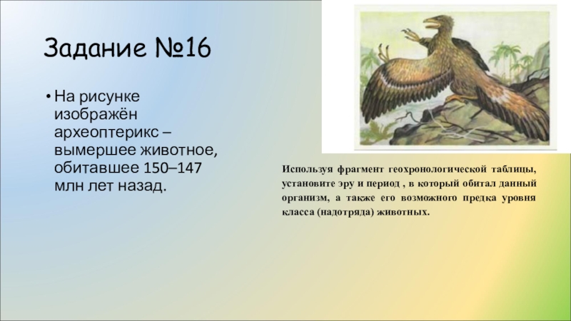 Используя фрагмент геохронологической таблицы, установите эру и период , в который обитал данный организм, а также его возможного предка уровня класса (надотряда) животных.