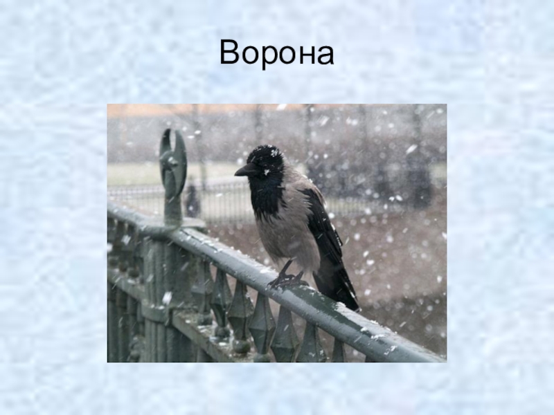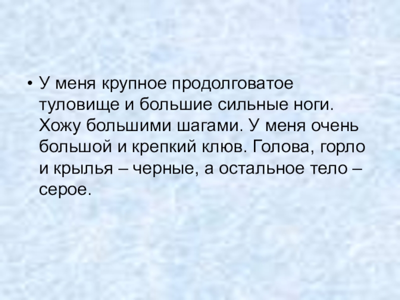 шагами. У меня очень большой и крепкий клюв. Голова, горло и крылья – черные, а остальное тело – серое.
