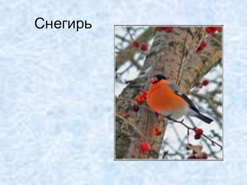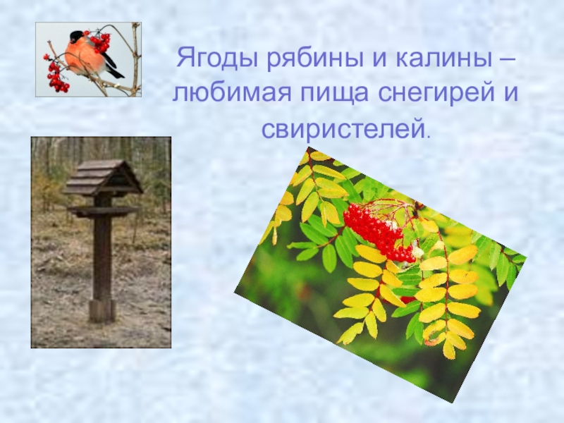 Слайд 28Ягоды рябины и калины – любимая пища снегирей и свиристелей.