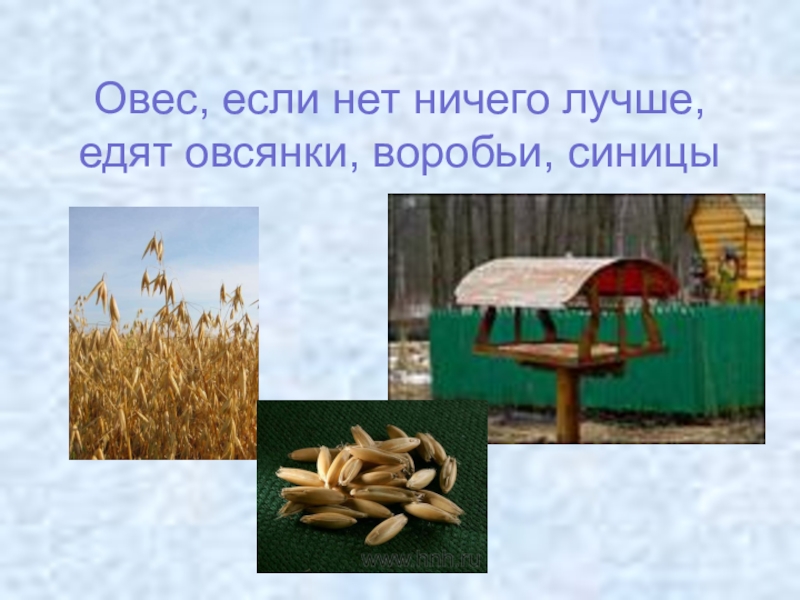 Слайд 26Овес, если нет ничего лучше, едят овсянки, воробьи, синицы