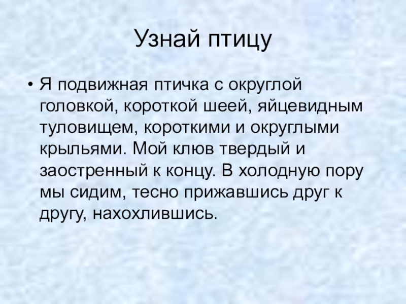 короткими и округлыми крыльями. Мой клюв твердый и заостренный к концу. В холодную пору мы сидим, тесно прижавшись друг к другу, нахохлившись.