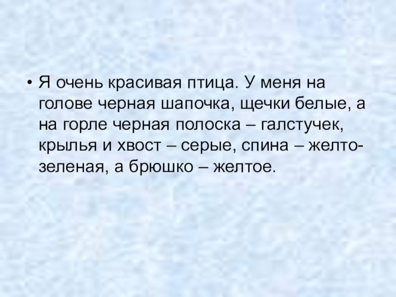 Я очень красивая птица. У меня на голове черная шапочка, щечки