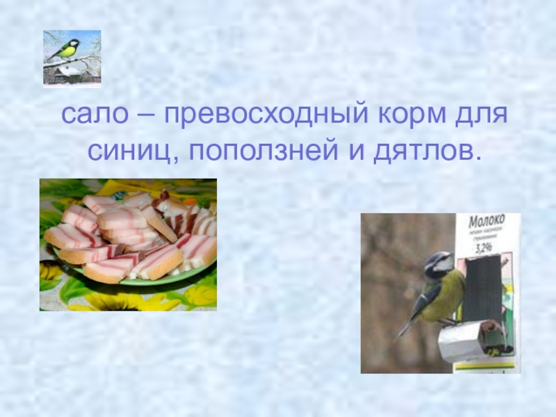 Слайд 30сало – превосходный корм для синиц, поползней и дятлов.