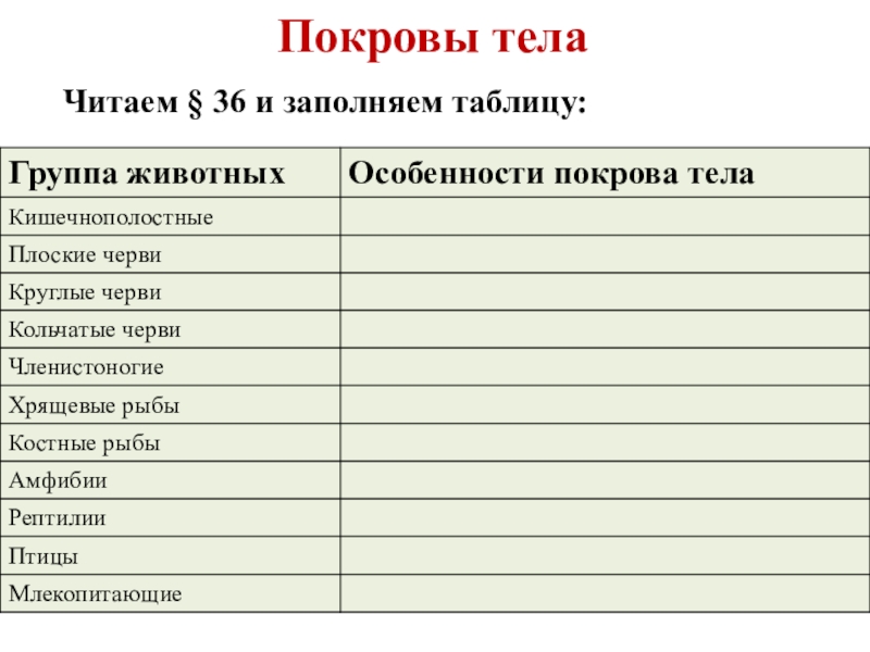Читаем § 36 и заполняем таблицу:Покровы тела