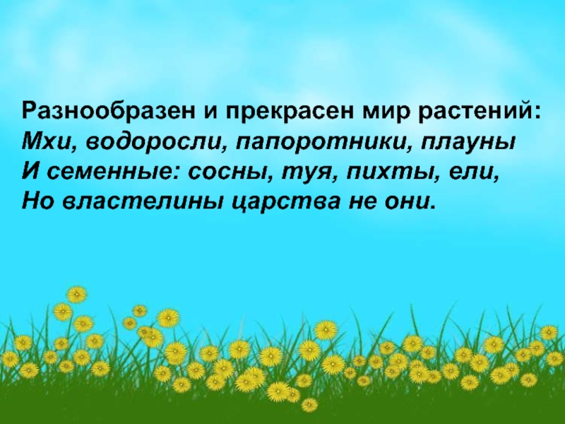 Разнообразен и прекрасен мир растений:Мхи, водоросли, папоротники, плауныИ семенные: сосны, туя, пихты, ели,Но властелины царства не они.