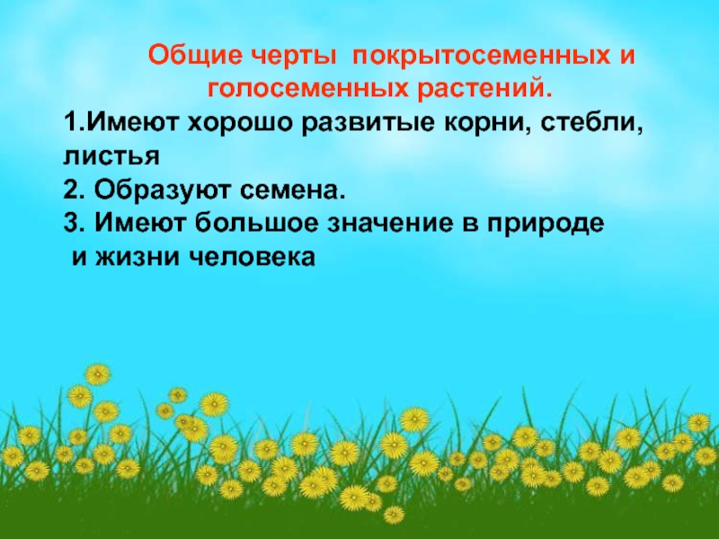 Общие черты покрытосеменных и голосеменных растений.   1.Имеют хорошо развитые корни, стебли, листья2. Образуют