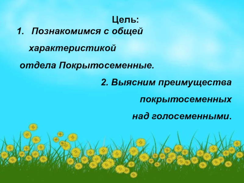 Цель: Познакомимся с общей характеристикой отдела Покрытосеменные. 2. Выясним преимущества покрытосеменных над голосеменными.