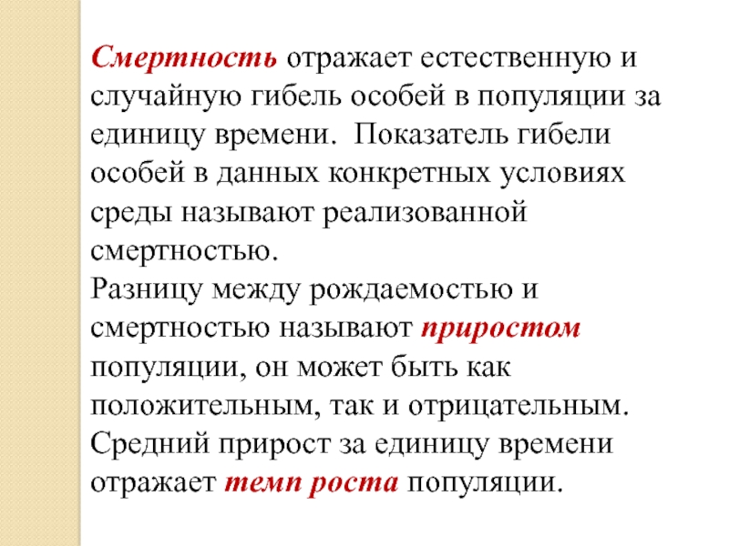 Слайд 13Смертность отражает естественную и случайную гибель особей в популяции за единицу