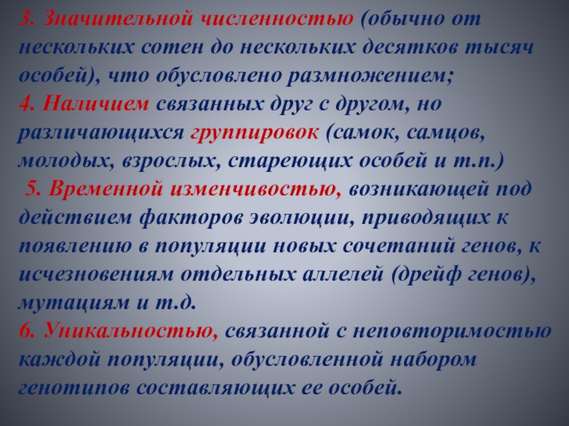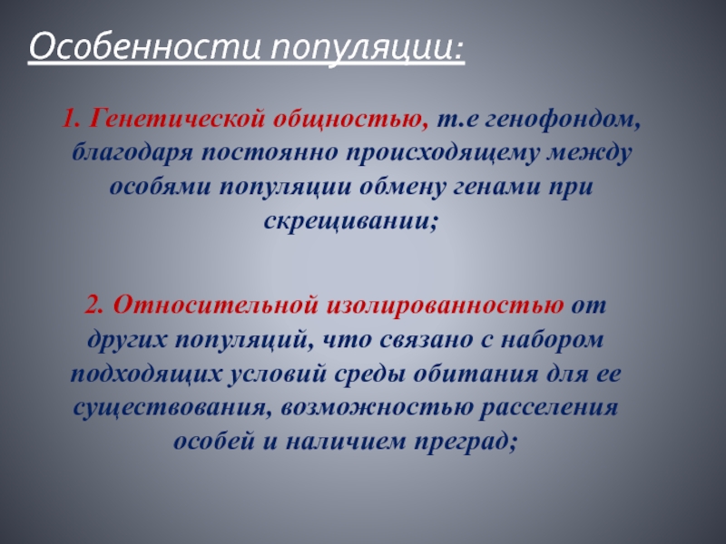 2. Относительной изолированностью от других популяций, что связано с набором подходящих условий среды обитания для ее существования, возможностью расселения особей и наличием преград;