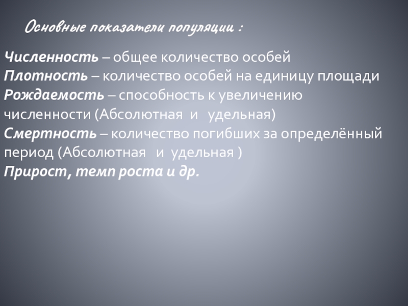Основные показатели популяции :