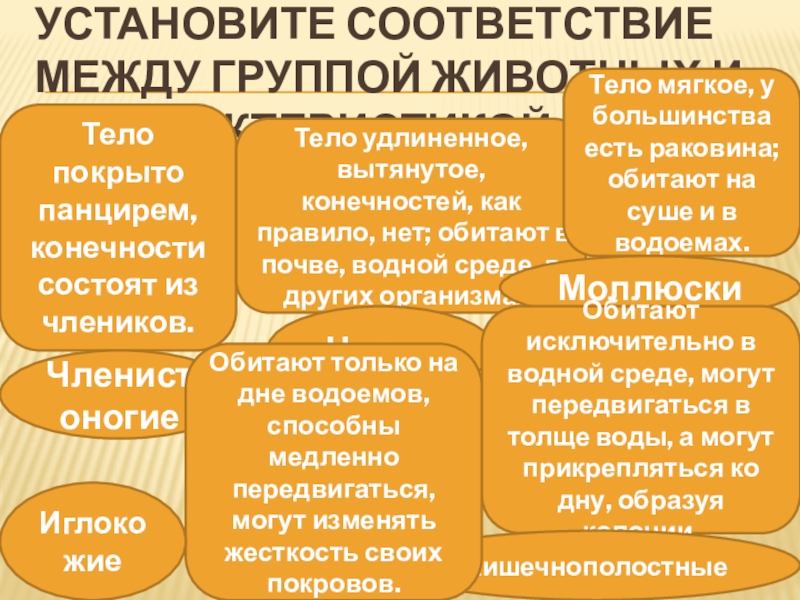 Тело удлиненное, вытянутое, конечностей, как правило, нет; обитают в почве, водной среде, в других организмах.
