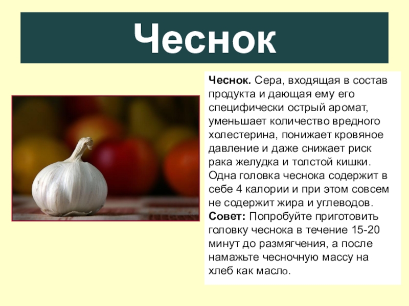 острый аромат, уменьшает количество вредного холестерина, понижает кровяное давление и даже снижает риск рака желудка и толстой кишки. Одна головка чеснока содержит в себе 4 калории и при этом совсем не содержит жира и углеводов.
