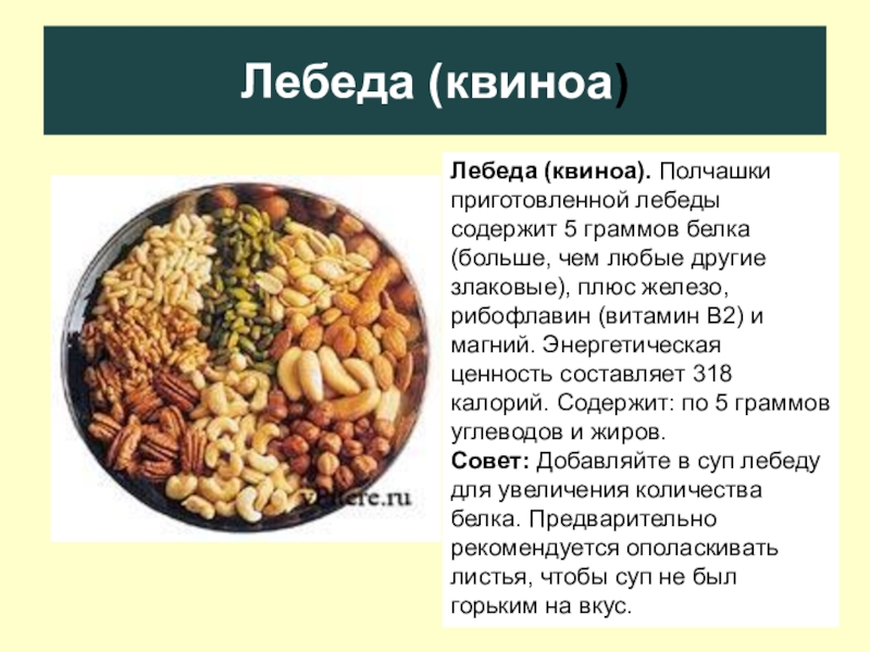 Лебеда (квиноа). Полчашки приготовленной лебеды содержит 5 граммов белка (больше,