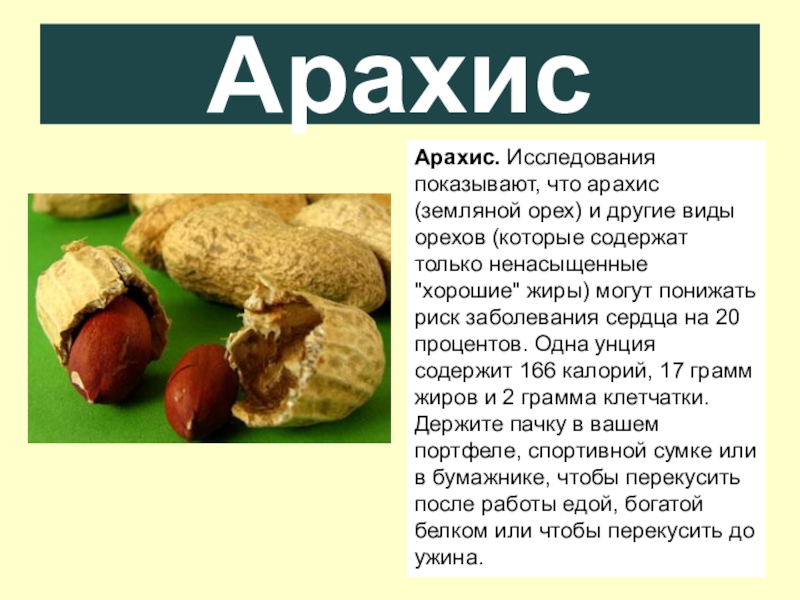 Арахис. Исследования показывают, что арахис (земляной орех) и другие виды орехов