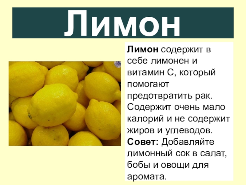 Лимон содержит в себе лимонен и витамин C, который помогают предотвратить