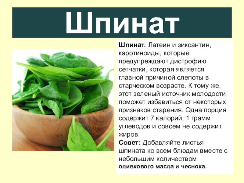 Шпинат. Латеин и зиксантин, каротиноиды, которые предупреждают дистрофию сетчатки, которая является