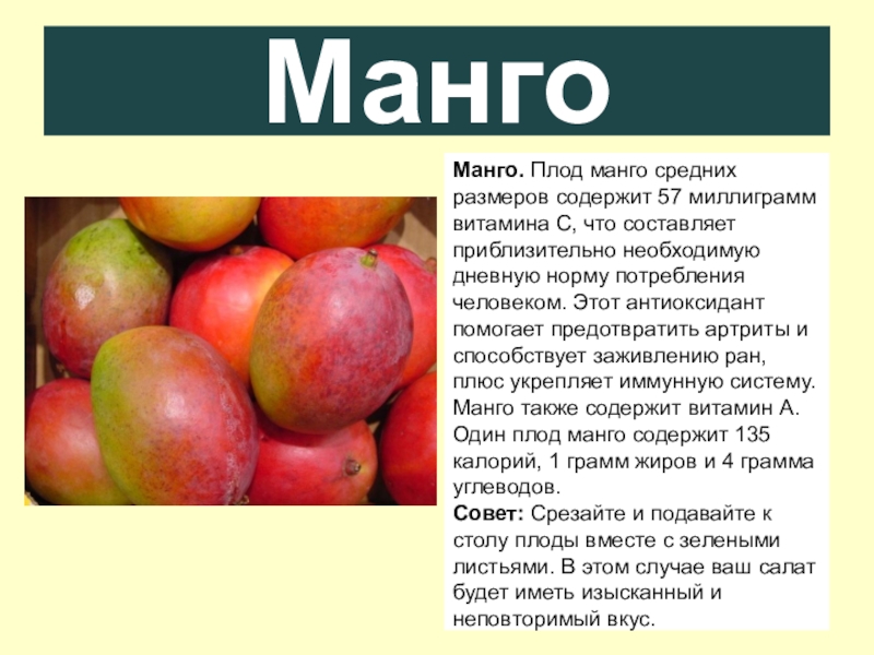 составляет приблизительно необходимую дневную норму потребления человеком. Этот антиоксидант помогает предотвратить артриты и способствует заживлению ран, плюс укрепляет иммунную систему. Манго также содержит витамин А. Один плод манго содержит 135 калорий, 1 грамм жиров и 4 грамма углеводов.