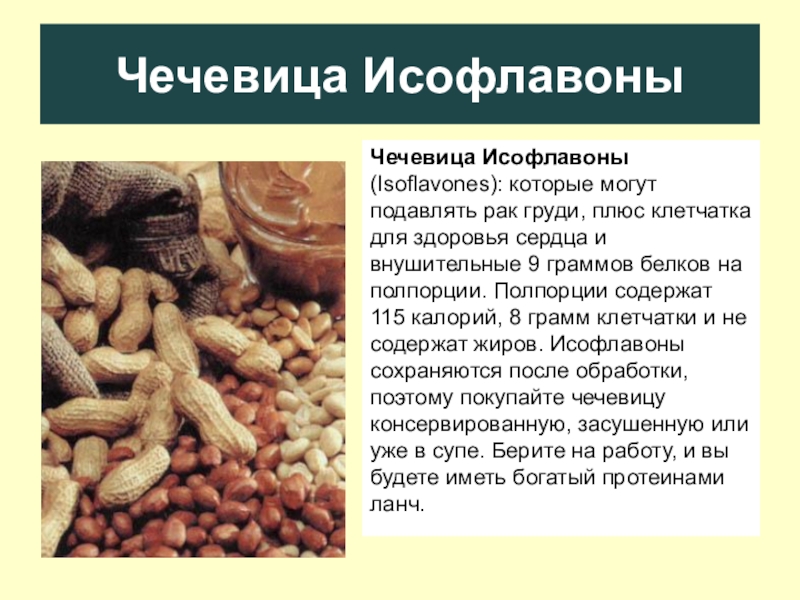 для здоровья сердца и внушительные 9 граммов белков на полпорции. Полпорции содержат 115 калорий, 8 грамм клетчатки и не содержат жиров. Исофлавоны сохраняются после обработки, поэтому покупайте чечевицу консервированную, засушенную или уже в супе. Берите на работу, и вы будете иметь богатый протеинами ланч.
