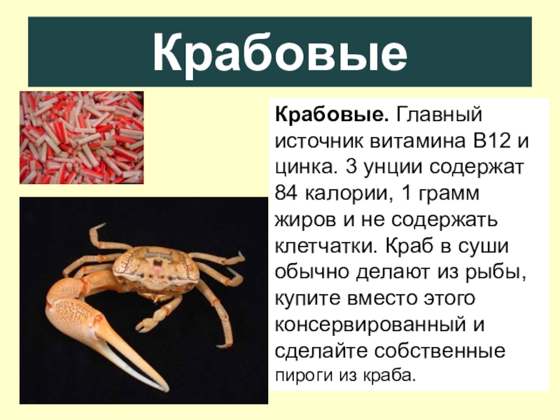 Крабовые. Главный источник витамина B12 и цинка. 3 унции содержат 84