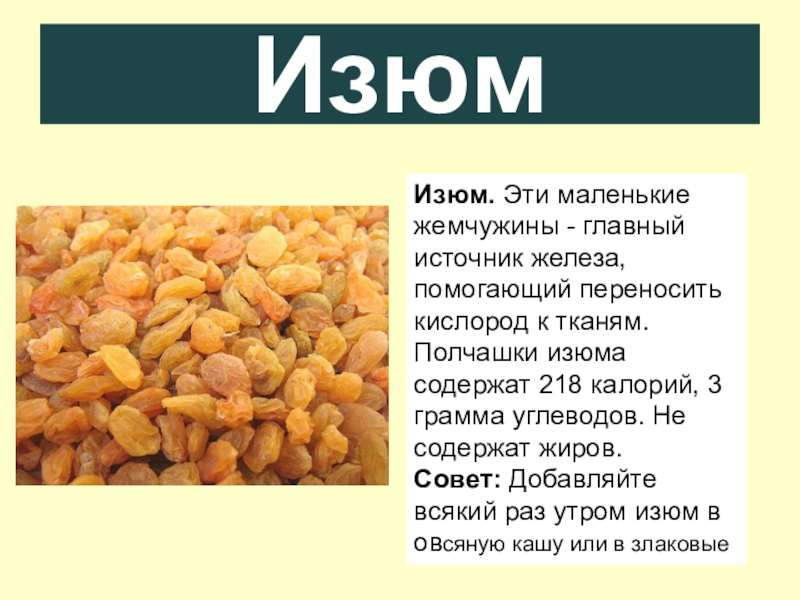 Изюм. Эти маленькие жемчужины - главный источник железа, помогающий переносить кислород