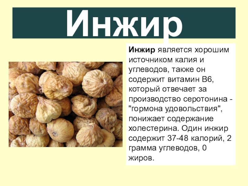 B6, который отвечает за производство серотонина - "гормона удовольствия", понижает содержание холестерина. Один инжир содержит 37-48 калорий, 2 грамма углеводов, 0 жиров.