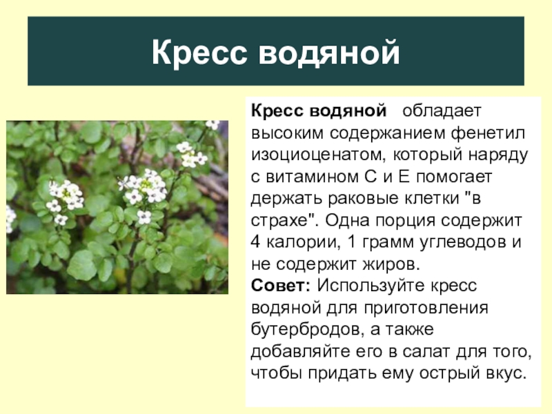 Кресс водяной обладает высоким содержанием фенетил изоциоценатом, который наряду