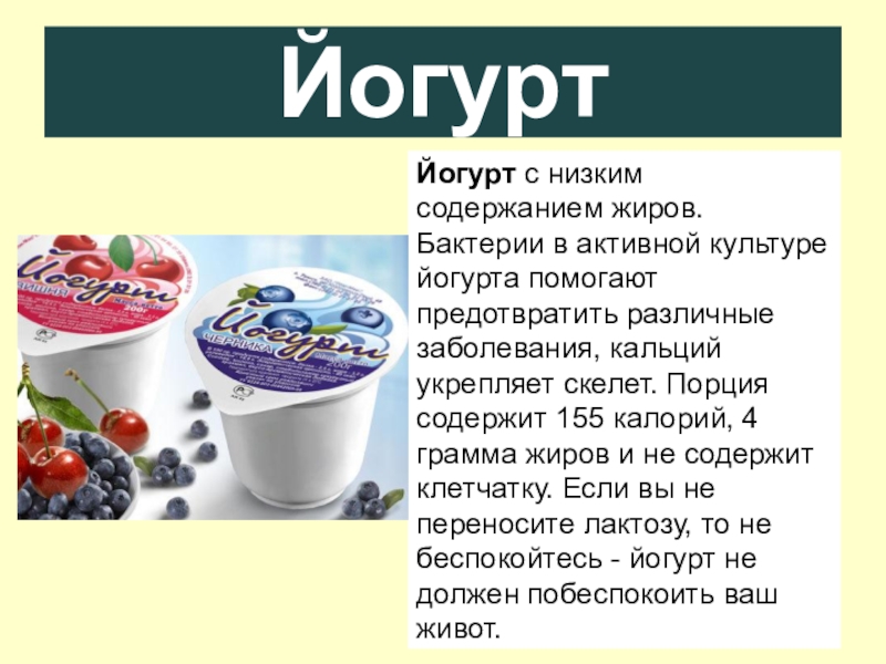 предотвратить различные заболевания, кальций укрепляет скелет. Порция содержит 155 калорий, 4 грамма жиров и не содержит клетчатку. Если вы не переносите лактозу, то не беспокойтесь - йогурт не должен побеспокоить ваш живот.