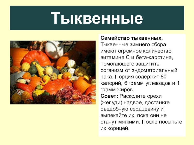 Семейство тыквенных. Тыквенные зимнего сбора имеют огромное количество витамина С и