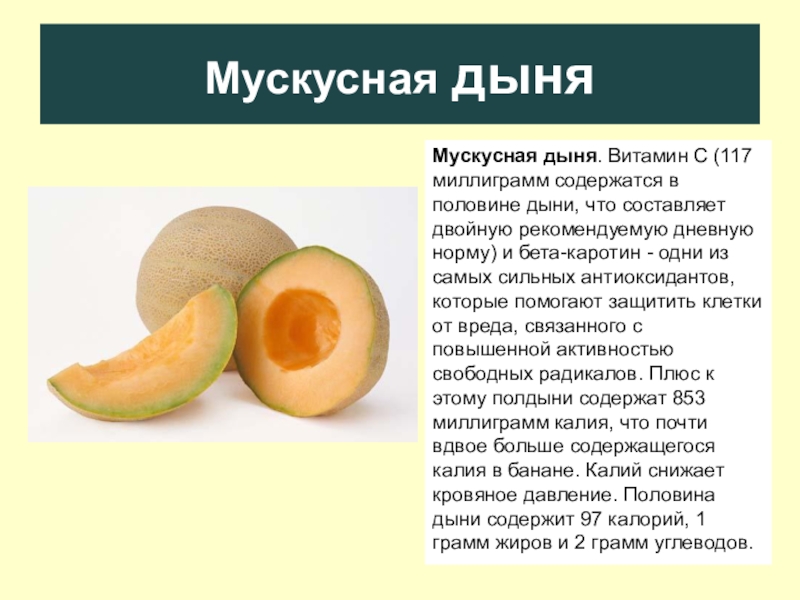 что составляет двойную рекомендуемую дневную норму) и бета-каротин - одни из самых сильных антиоксидантов, которые помогают защитить клетки от вреда, связанного с повышенной активностью свободных радикалов. Плюс к этому полдыни содержат 853 миллиграмм калия, что почти вдвое больше содержащегося калия в банане. Калий снижает кровяное давление. Половина дыни содержит 97 калорий, 1 грамм жиров и 2 грамм углеводов.