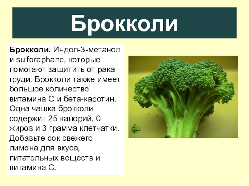 Брокколи. Индол-3-метанол и sulforaphane, которые помогают защитить от рака груди. Брокколи