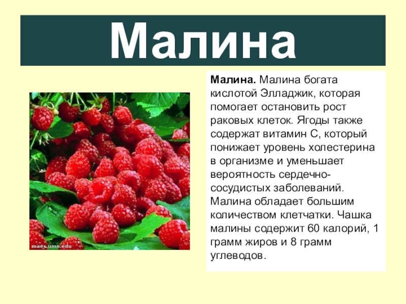 Малина. Малина богата кислотой Элладжик, которая помогает остановить рост раковых клеток.