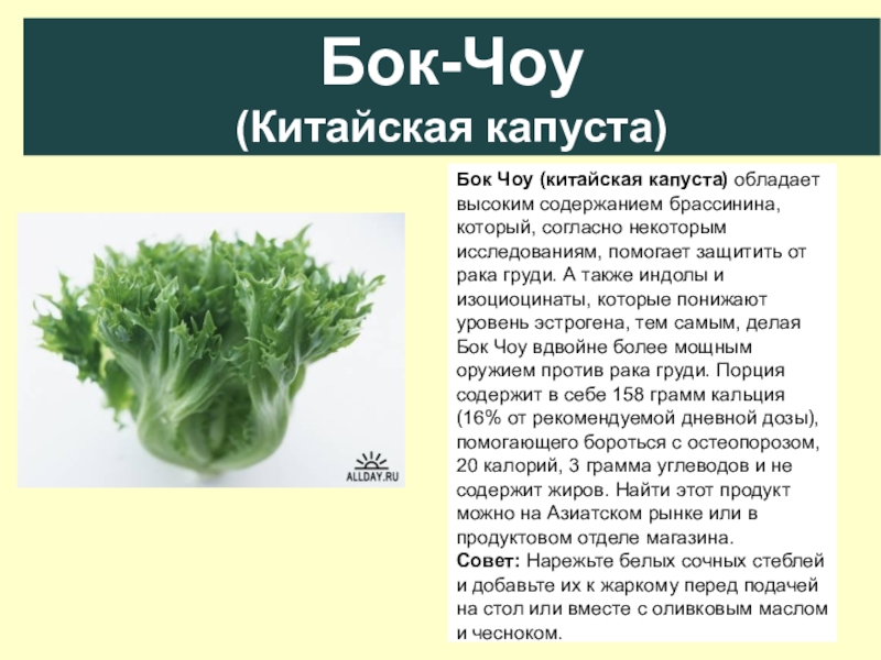 Бок Чоу (китайская капуста) обладает высоким содержанием брассинина, который,