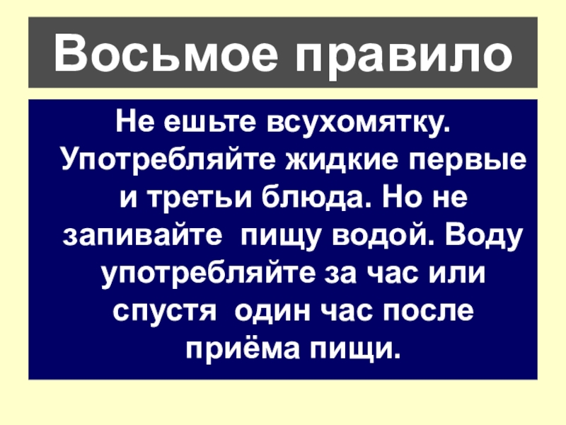 не запивайте пищу водой. Воду употребляйте за час или спустя один час после приёма пищи.