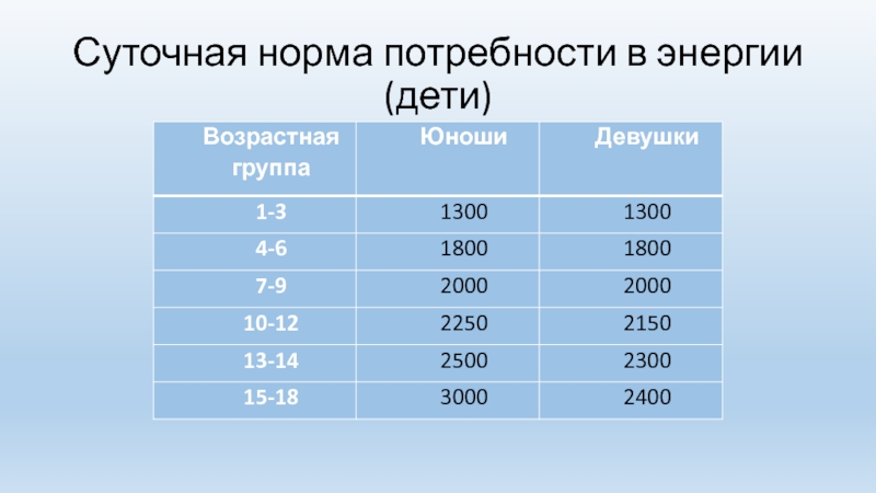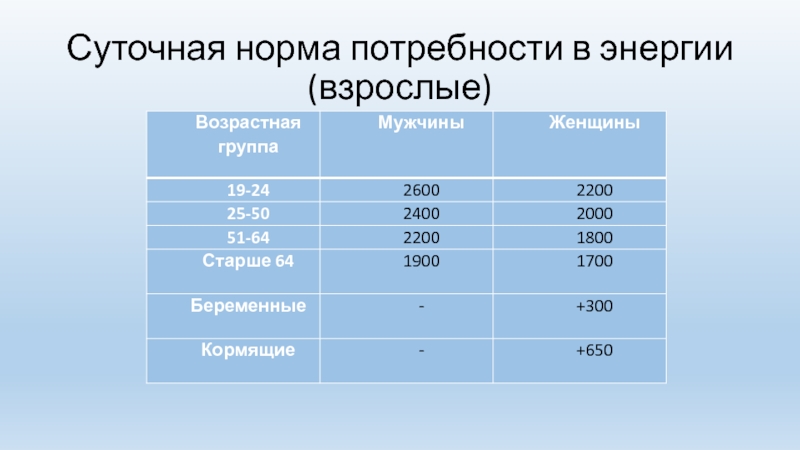 Слайд 9Суточная норма потребности в энергии(взрослые)
